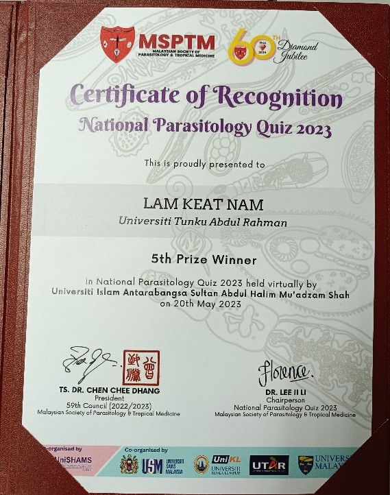 fifth prize at the Malaysian Society of Parasitology and Tropical Medicine