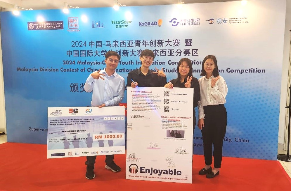 A team of Faculty of Information and Communication Technology students, namely Lee Wei Song, Kuek En Yee, Kwong Guan Yuan and Loh Jia Yee, was one of the third prize winners at the 3rd Malaysian-China Youth Innovation Competition, held on 29 June 2024 at Xiamen University Malaysia. The team took home a cash prize of RM 1,000 as the winning prize.