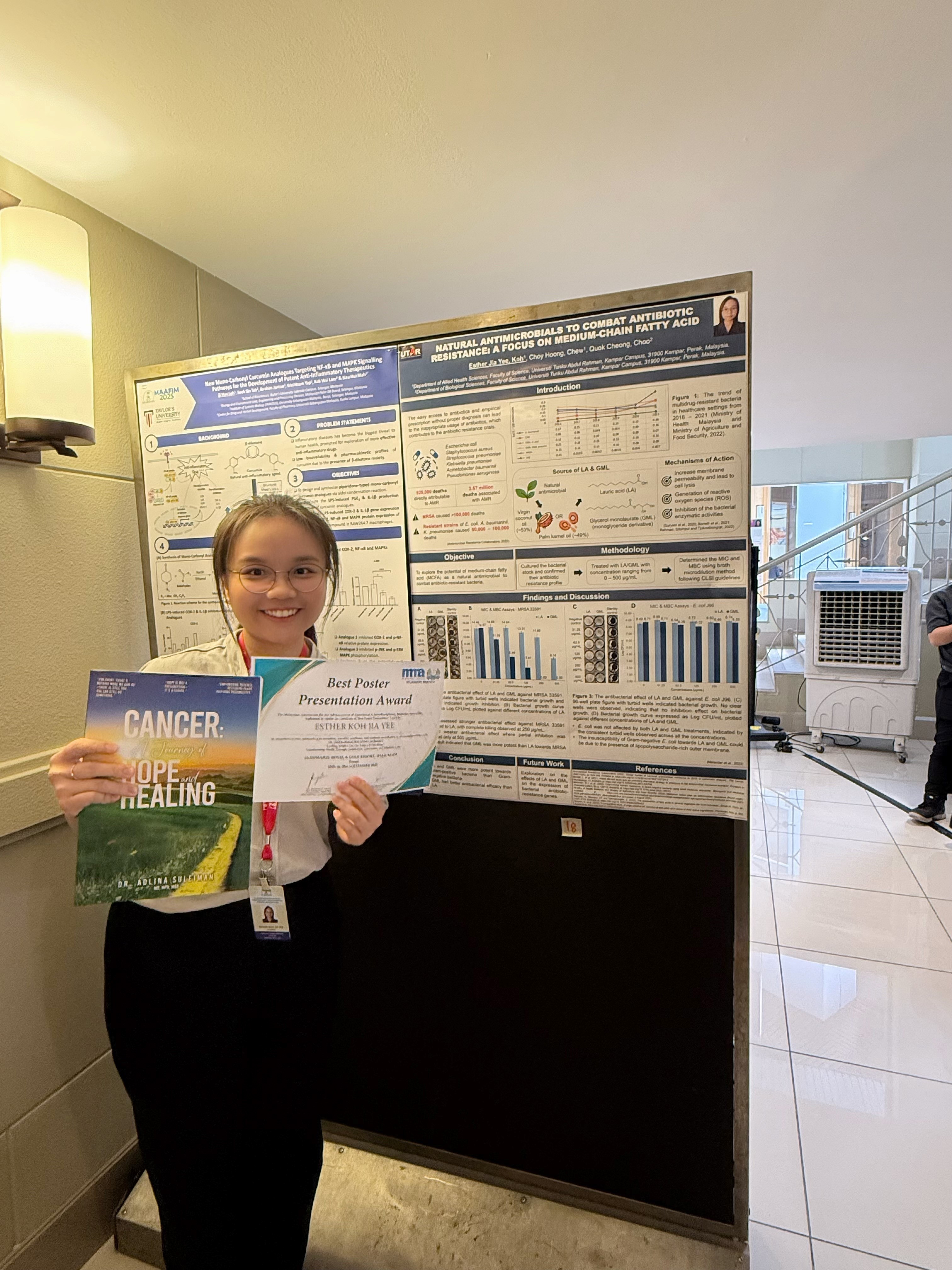 Further elevating the achievement, Esther Koh was awarded the Best Poster Presentation Award for her research poster titled Natural Antimicrobials to Combat Antibiotic Resistance: A Focus on Medium-Chain Fatty Acid. Her study addressed the growing global health challenge of antibiotic resistance, which has increasingly reduced the effectiveness of conventional antibiotics.