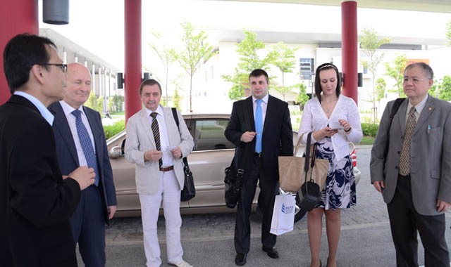 Lee (left) welcoming (from right) Teoh, Oksana, Dr Andrey, Prof Alexander