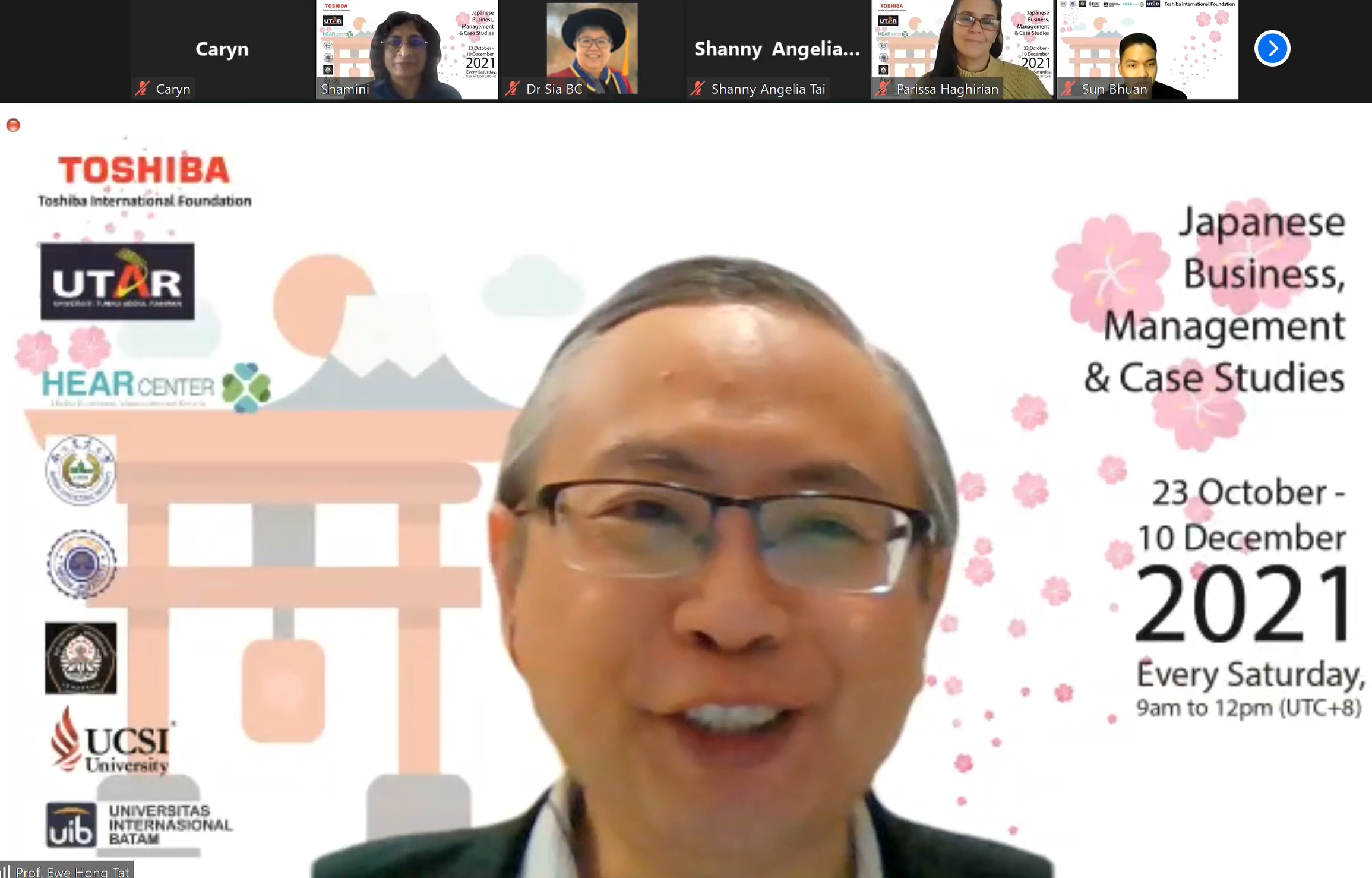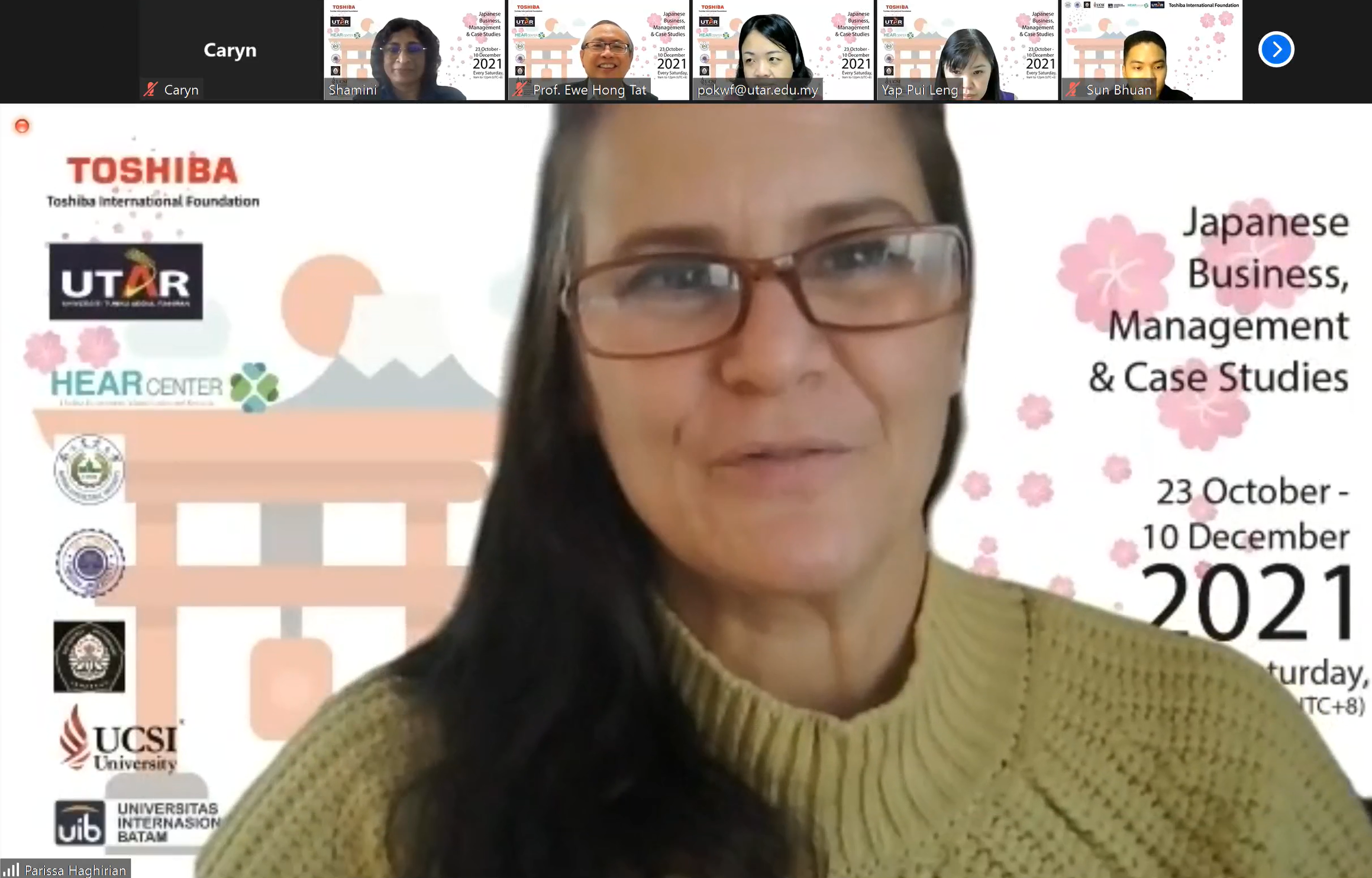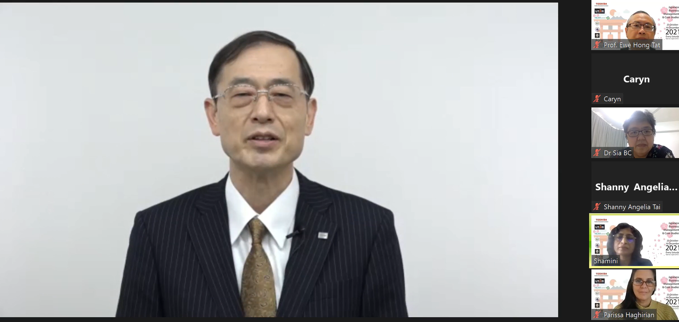The opening ceremony of the online lecture series on Japanese Business Management and Case Studies took place on 23 October 2021 via Zoom. About 465 students from 10 economies and 17 universities registered for the lecture series to get a better understanding of the difference in culture in the business landscape. Aside from that, the Faculty of Accountancy and Management (FAM) aimed to expose students to broader knowledge so that they can become successful managers in international organisations by understanding the principal factors that influence international business management, especially in Japanese firms. The online lecture series, sponsored by Toshiba International Foundation, will be presented by Sophia University, Tokyo Prof Parissa Hagririan.