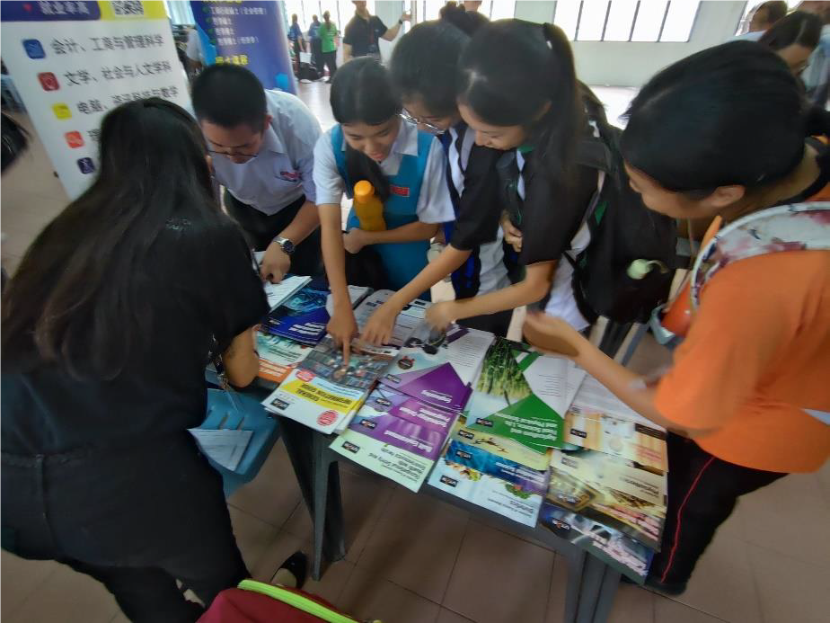 SMJK Pei Yuan students inquiring about the programmes offered at UTAR at a DPP booth set up in the hall