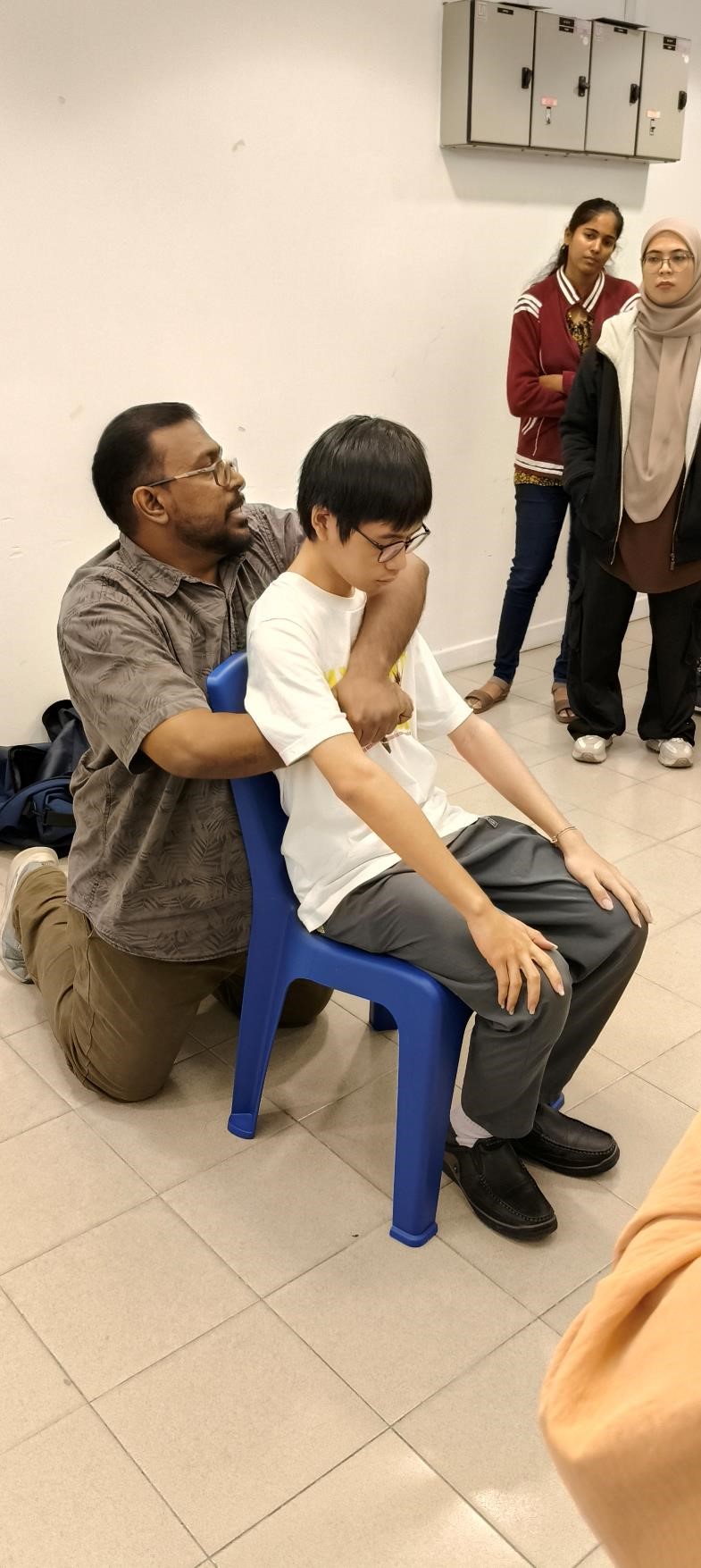 The workshop provided a comprehensive foundation in first aid theory, emphasising critical “Dos and Don’ts” for initial response. Participants learnt that the cornerstone to any emergency intervention is to immediately call professional medical services, because time, as stressed by the trainer, is a crucial factor in saving lives and reducing long-term disability. The trainer, Mr Devendraraj also highlighted the importance of keeping both the responder and victim safe, including calming the individual and positioning them appropriately while keeping them company.