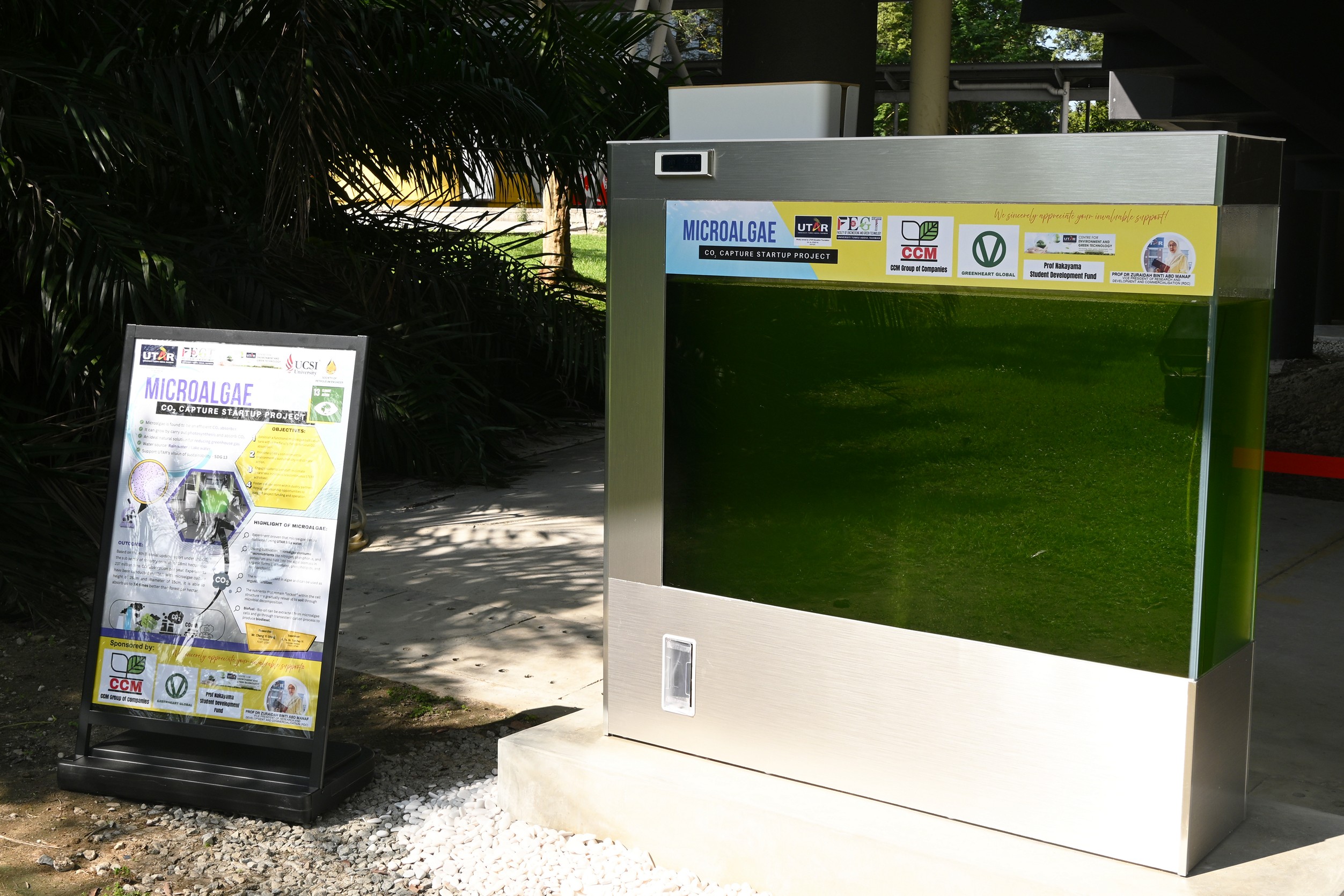 A live microalgae system designed to absorb carbon dioxide, showcasing research-driven solutions for a greener campus