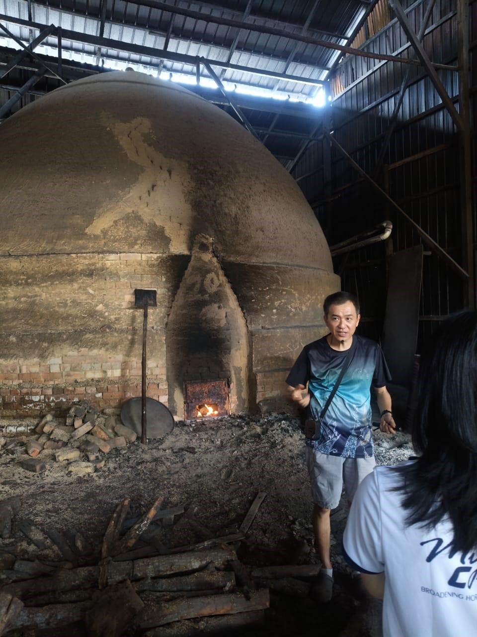 Mr Chuah explaining the charcoal-making process in front of the clay oven (kiln)