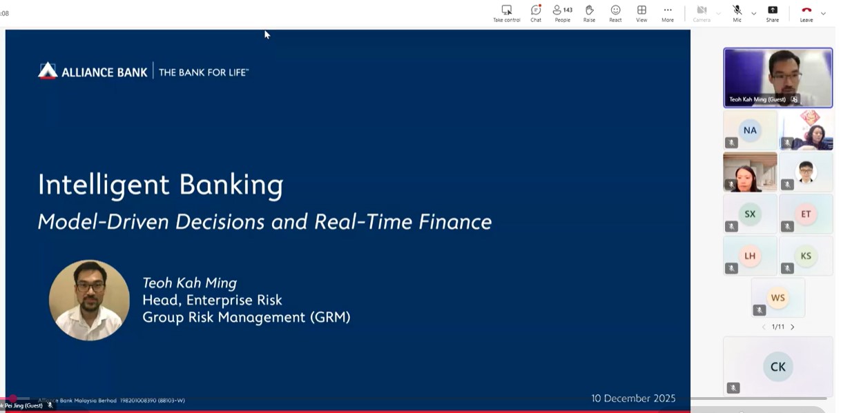 The Department of Banking and Risk Management organised an online talk titled Intelligent Banking: Model-Driven Decisions & Real-Time Finance on 10 December 2025 via the Microsoft Teams platform. The session was delivered by Mr Teoh Kah Ming, Head of Enterprise Risk Management at Alliance Bank Malaysia Berhad. The one-hour talk attracted 291 participants, comprising UTAR staff and students.
