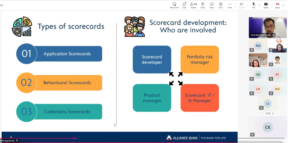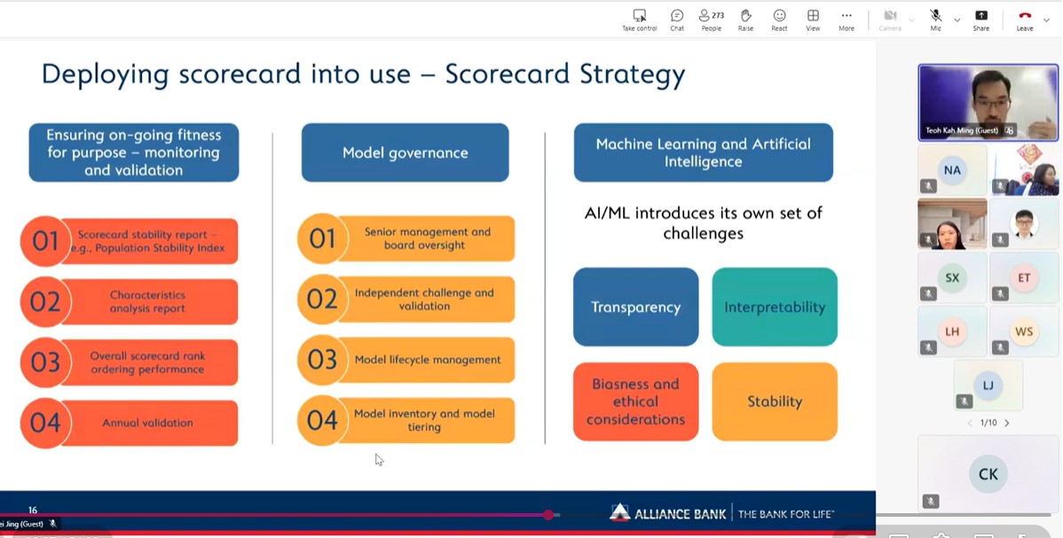 The talk also covered key risk management tools, particularly credit scorecards. Mr Teoh outlined three main types: application scorecards for new loan assessments, behavioural scorecards for existing customers, and collection scorecards for managing delinquent accounts. He compared modern machine learning approaches with traditional logistic regression, noting that while machine learning models are powerful, traditional methods are often preferred for their transparency and ease of regulatory compliance.