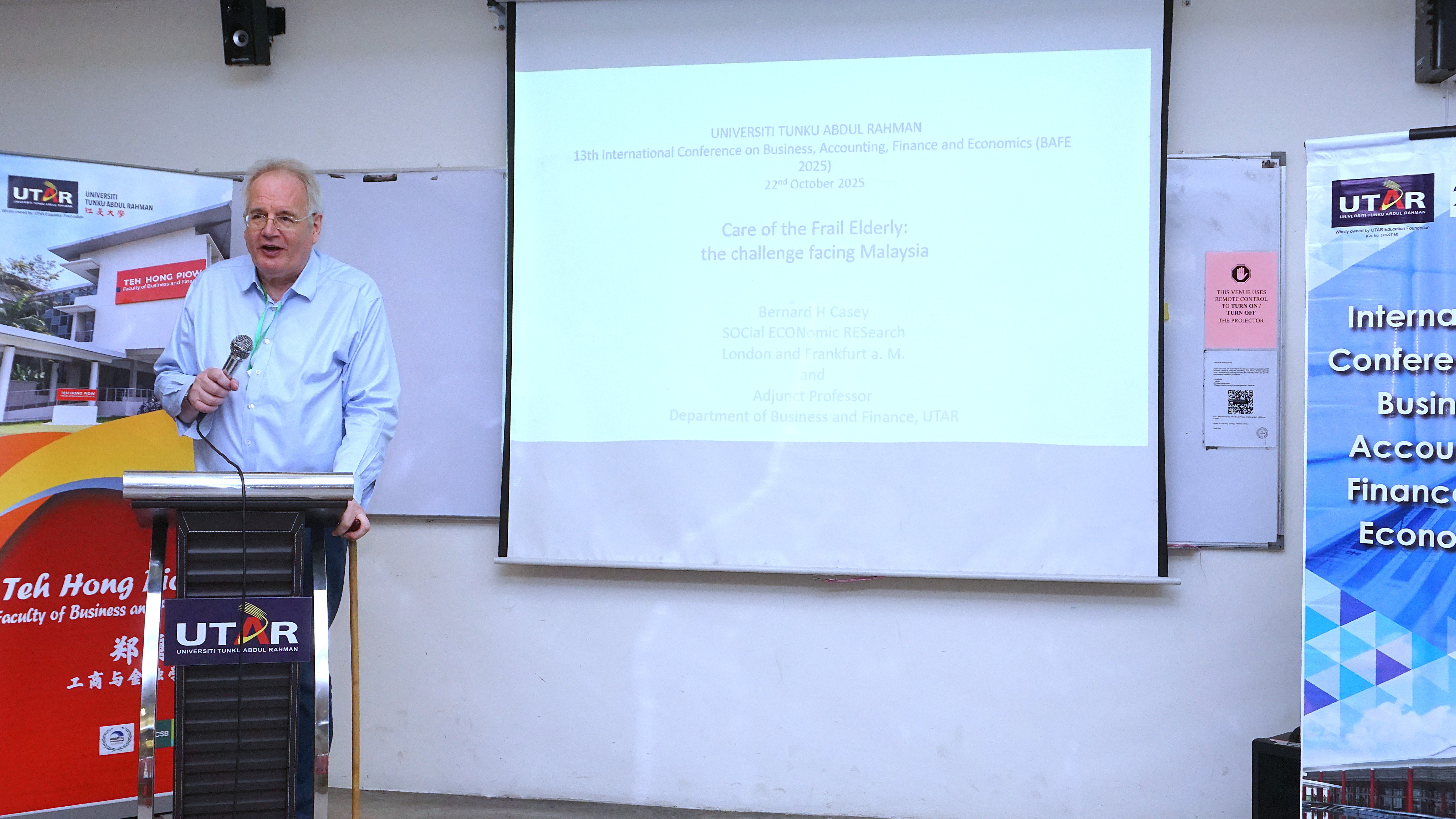 The conference continued with the keynote sessions by three speakers. Prof Dr Bernard H Casey, Adjunct Professor of THP FBF from SOCial ECONomic RESearch, London and Frankfurt, spoke on Care for the Frail Elderly: The Challenge Facing Malaysia. His presentation offered an in-depth understanding on the impact of innovative businesses in driving sustainable development. He highlighted the urgent need for systemic innovation to address rising social care demands. He discussed leveraging AI, such as intelligent health monitoring systems, predictive analytics for resource planning, and automation in elderly care. These approaches align with SDG 3: Good Health and Well-Being, SDG 8: Decent Work and Economic Growth, and SDG 10: Reduced Inequalities, showcasing that the integration of human-centred policies and AI-driven innovation can ensure both economic resilience and social sustainability in an ageing society.